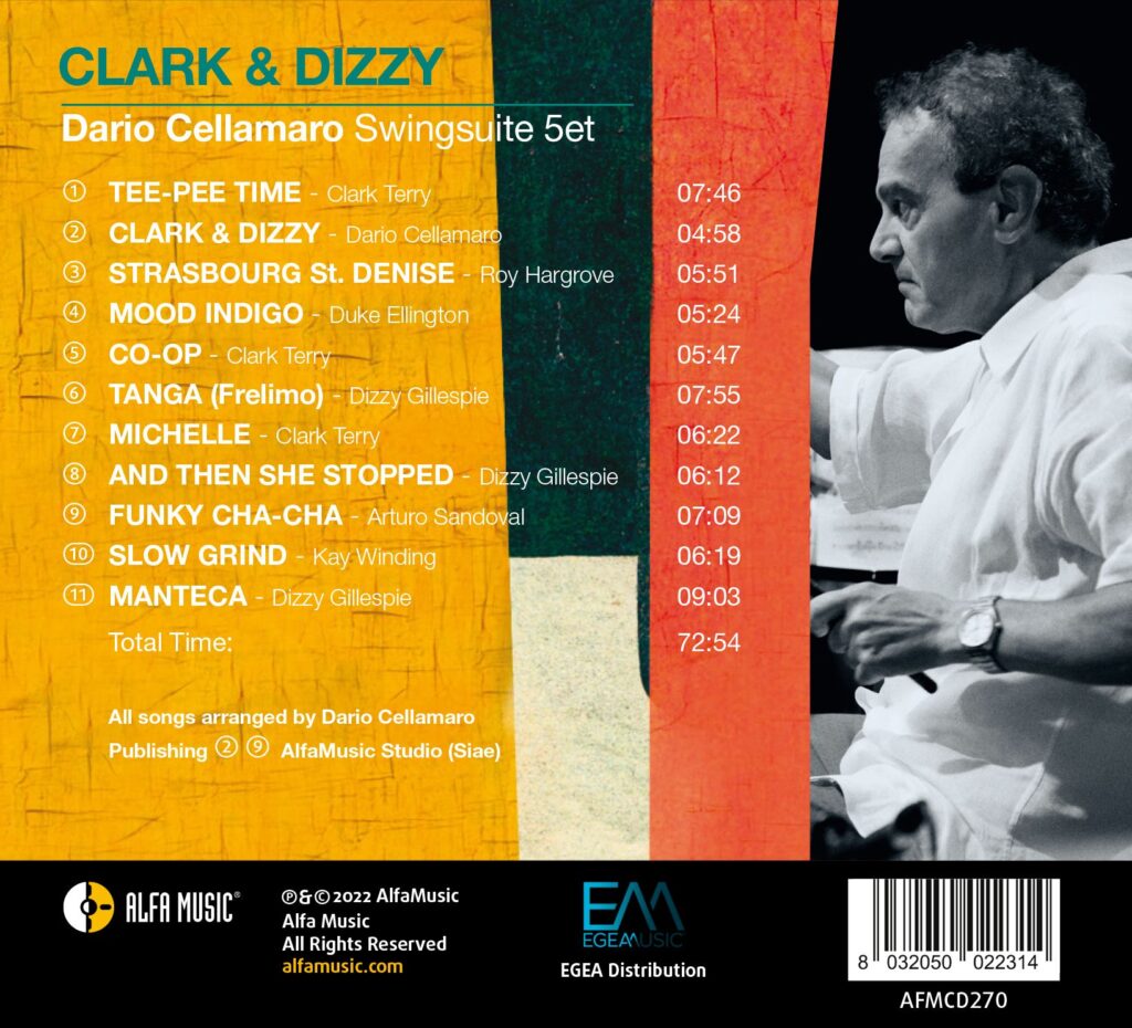 È superfluo sottolineare che l’album «Clark & Dizzy», oltre ad essere visceralmente sentito, risulti molto coinvolgente. Tutto il line-up, costituito da Carlo Uboldi piano, Emilio Soana tromba e flicorno, Danilo Moccia trombone, Antonio Cervellino contrabbasso e Dario Cellamaro batteria e percussioni, pattina su una pista swing-latin-bop con estrema disinvoltura ed in maniera sinergica. Il batterista-leader racconta la genesi costruttiva dell’album: «Ho scelto i loro brani (quelli di Diz e Clark) insieme ad altri, li ho arrangiati, ritrascritti e per uno in particolare, «Funky Cha-Cha» di Arturo Sandoval con cui tenterò di ripetere l’esperienza avuta con Clark Terry inviandogli una copia di questo lavoro, ho ridotto un arrangiamento da big band (18 elementi) a soli cinque strumenti. Un lavoro stressante ed impegnativo ma che mi ha reso immensamente felice quella sera del 13 agosto 2022 sul palco di Villa Cagnola a Gazzada. Oltre a Clark & Dizzy, che ho voluto omaggiare componendo un brano originale che porta lo stesso titolo, ho esteso il tributo ad altri grandi interpreti come Duke Ellington, Roy Hargrove e Kay Winding».