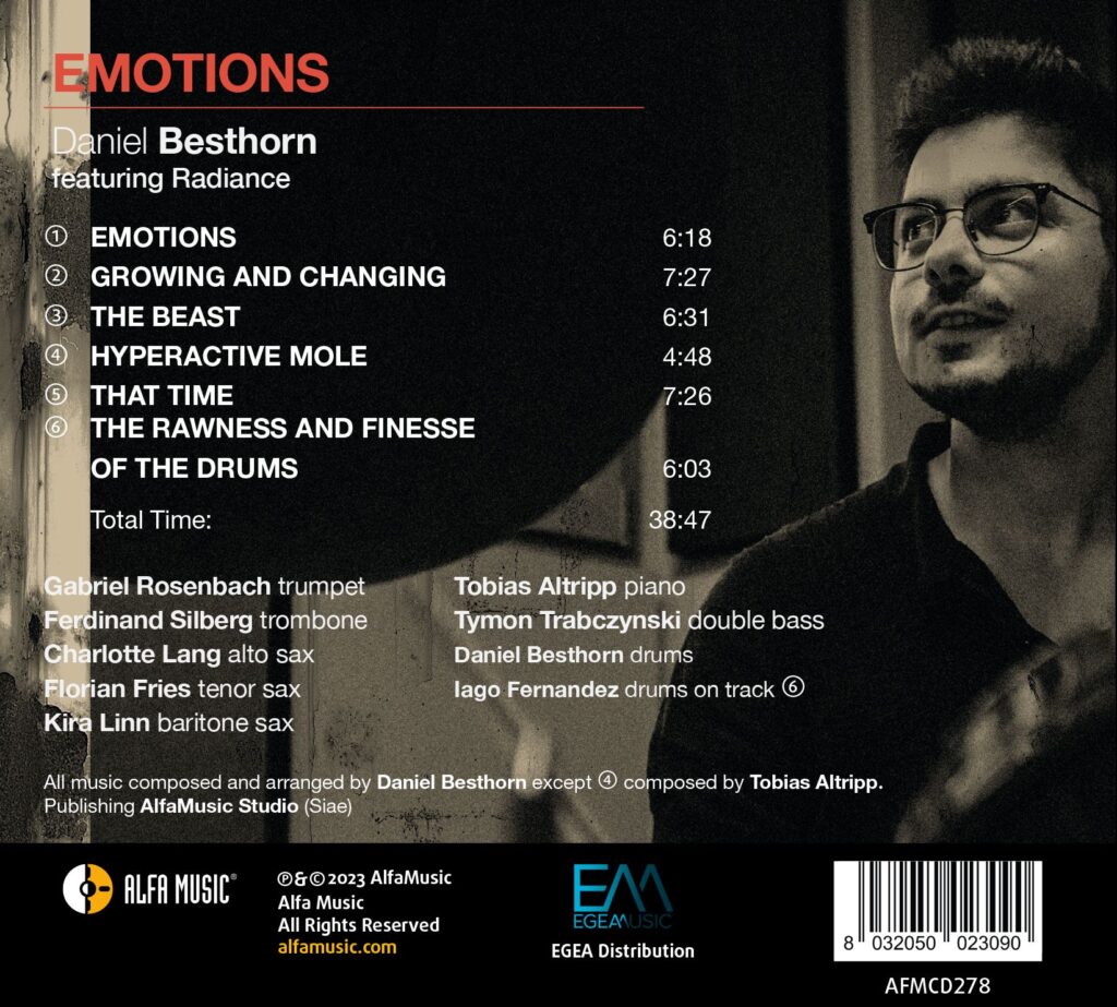 «That Time» si materializza come una ballata intensa e crepuscolare dal sapore vagamente retrò, dove l’ensemble mostra un ottimo livello strumentale, fatto di controllo del suono, pulsazione e fraseggio. «The Rawness And Finesse Of The Drums» è quasi un ode da parte di Daniel Besthorn al proprio strumento «La crudezza e la raffinatezza della batteria». Al contempo, però, la lunga maratona di oltre sei minuti, completamente imperniata sul kit percussivo, diventa per l’autore anche una catarsi liberatoria. «Emotions» di Daniele Besthorn Feat. Radiance è un’opera prima frutto della collaborazione di giovani musicisti che denotano un grado di competenza superiore alla media, dove la naturalezza nello swing e nell’ interplay si uniscono ad un impianto sonoro articolato sul piano della dinamica e ricco di cromatismi, sfumature emotive e strumentali.