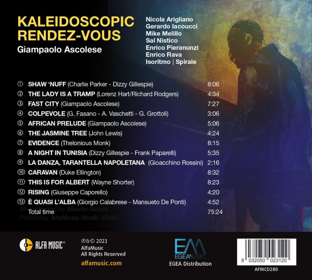«Kaleidoscopic Rendez-vous», pubblicato da Alfa Music è un piccolo scrigno che raccoglie molte perle rare dell’attività del batterista-percussionista, ma anche un disco coraggioso che unisce materiali freschi di conio a registrazioni effettuate in passato con musicisti e sodali illustri. Le parole di Ascolese sono alquanto illuminanti in proposito: «Non basta ovviamente a testimoniare tutto il mondo musicale che ho attraversato, ma documenta molto significativamente il mio percorso che ho voluto descrivere cronologicamente nella sequenza dei brani. Nel disco, oltre a registrazioni effettuate principalmente per esso, sono incluse vecchie incisioni effettuate con «giganti» del Jazz d’oltreoceano con i quali ho avuto l’onore di collaborare».