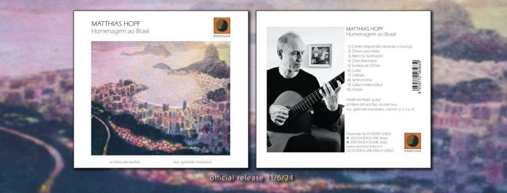Da lungo tempo il Brasile costituisce una particolare giunzione tra il jazz ed alcun tipologie ibride di musiche e canzoni, sovente intrise di spunti eurodotti, divenendo così (idealmente) una forma di «quarta via» facilmente percorribile, soprattutto grazie all’ingente giacimento musicale che questo «grande paese» possiede: un universo di suoni, ritmi e contrasti etnico-culturali, da cui molti attingono. Scegliere il Brasile come motivo ispiratore e raccordo tra mondi sonori possibili è già una precisa scelta di campo. Da qualche giorno, è disponibile sul mercato, prodotto dall’etichetta pugliese Dodicilune, «Homenagem Ao Brasil» del chitarrista-compositore berlinese – bolognese di adozione – Matthias Hopf. Sostenuto nel suo excursus espositivo dal contrabbassista Andrea Lamacchia e dal clarinettista Gabriele Mirabassi, che funge da magnificatore di alcune tracce. Il musicista tedesco offre una visione del Brasile, quale terra ricca di contraddizioni e di contrasti che costituisce, nonostante la sua grandezza territoriale, un’enclave sonora rispetto a tutto il resto del continente Centro-Nord-Americano. Il Brasile ha subito meno l’influenza dell’Africa ed in maniera diversa, se paragonato a tutto il resto delle Amerindie; la sua musica possiede delle matrici marcatamente europee; ha adottato una lingua diversa ed unica, il portoghese che, quando usata, produce un cantato più morbido e flessuoso, a tratti più vicino al francese, fatto di languori, atmosfere malinconiche e chiaro-scuri emotivi. Dice Hopf: «Il suo fascino (quello del Brasile) per me è dovuto alla strana combinazione di melodie e armonie europee dal sapore spesso malinconico con l’elemento ritmico vitale della musica africana, una apparente contraddizione». «»
