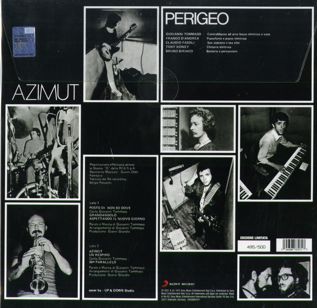 Il Perigeo si coagulò nel 1971 attorno alla visionarietà di Giovanni Tommaso, contrabbassista con una lunga frequentazione internazionale. Le collaborazioni con Lee Konitz, Chet Baker, Barney Lewis, Gato Barbieri, Sonny Rollins, Dexter Gordon, Steve Lacy e Lionel Hampton avevano sedimentato una conoscenza abissale del jazz americano, non come repertorio da imitare, ma come grammatica da trasformare. Tommaso immaginò un gruppo che partisse da un tessuto jazzistico solido aprendosi a contaminazioni molteplici, ma soprattutto lasciando che l’improvvisazione potesse diventare un luogo di libertà condivisa e non un mero esercizio di virtuosismo o una vetrina narcisistica ed individuale. La scelta dei musicisti rispose a tale logica. Franco D’Andrea portò con sé un bagaglio vasto, edificato accanto a figure centrali del jazz europeo ed americano, nonché una lucidità pianistica che permetteva al gruppo di muoversi su piani diversi senza perdere coerenza. Bruno Biriaco, appena ventenne, introdusse una vitalità ritmica che univa disciplina e curiosità, frutto di studi che spaziavano dal pianoforte alla direzione d’orchestra. Claudio Fasoli, con la sua padronanza del linguaggio modale, garantì una voce abile nel districarsi tra rigore e apertura, mentre Tony Sidney, chitarrista statunitense trapiantato in Italia, portò un colore blues-rock che rompeva ogni possibile ortodossia. La sua presenza, apparentemente anomala, divenne uno degli elementi che definirono l’impalcatura della band. Il debutto dal vivo alla Bussola di Marina di Pietrasanta, nell’agosto del 1972, anticipò l’uscita di «Azimut», un album che scardinava anni di manierismo, istituendo un discorso musicale inedito, almeno per l’Italietta canzonettara. Su un substrato jazzistico vennero innestati elementi rock, funk, persino ambient ante-litteram, senza che nessuno degli elementi semantici prevalesse sugli altri. Ne scaturì una sonorità che non mirava a scimmiottare la metodologia americana, ma ambiva a dialogare con essa da una prospettiva autonoma. La critica colse solo parzialmente la portata dell’operazione; per contro il pubblico del rock, invece, ne rimase affascinato, come se il Perigeo avesse intercettato un bisogno latente di rinnovamento.